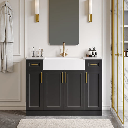 48" Black Freestanding Single Farmhouse Sink Bathroom Vanity with Stone Top