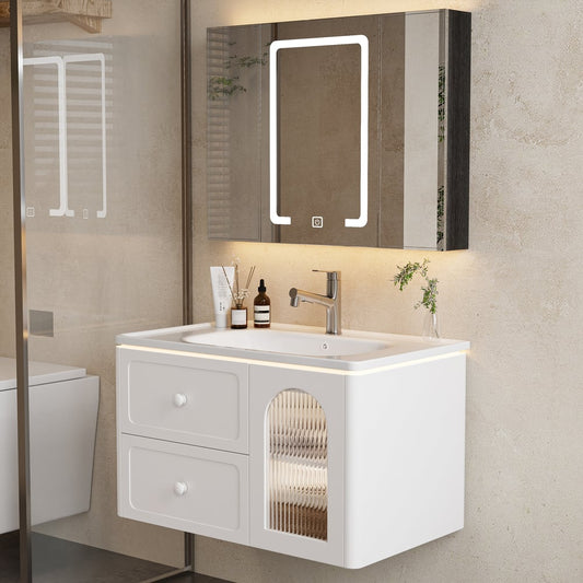 31.5" Modern Floating LED Bathroom Vanity with Ribbed Glass Door & Drawers