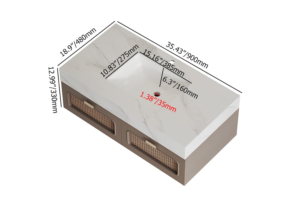 35" Floating Single Bathroom Vanity with Faux Marble Top Rattan Door