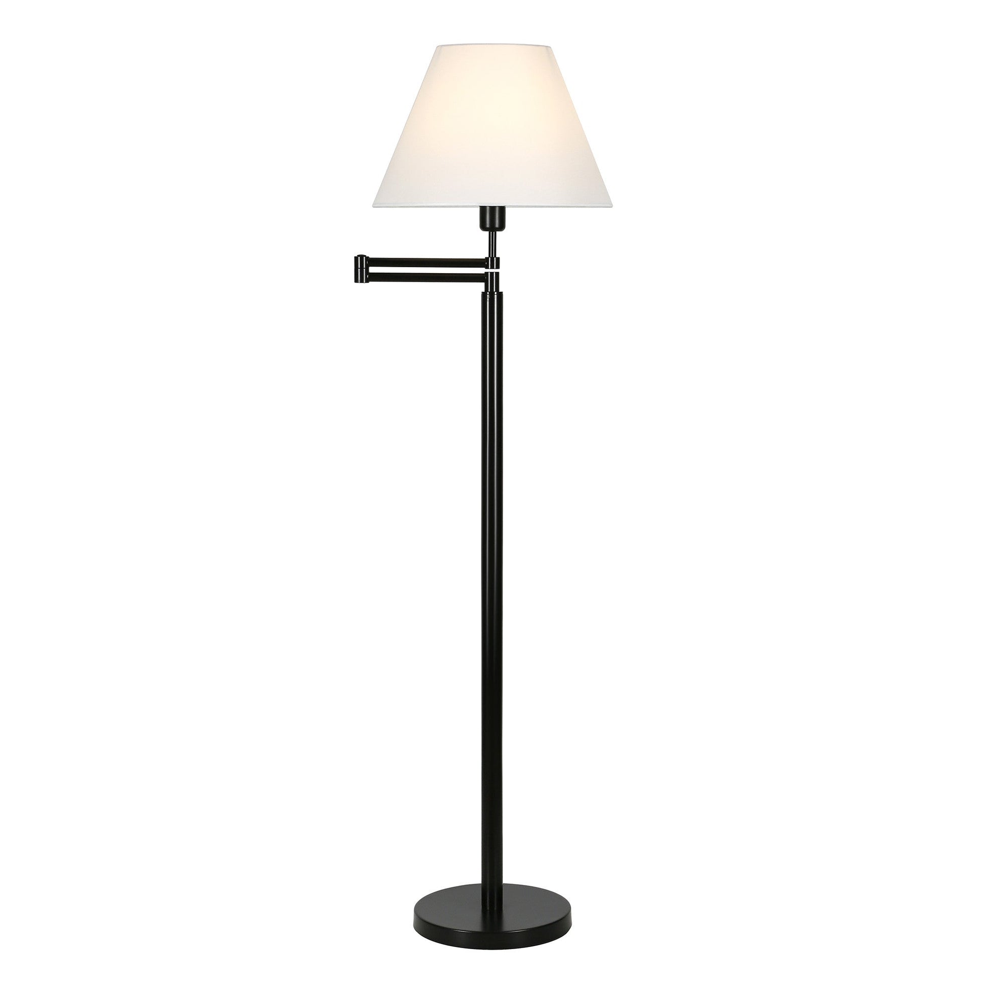 Bring of level of elegance and charm to your space with this good looking 62" black swing arm floor lamp with white frosted glass empire shade. The lamp is made of sturdy metal and features a black color. The lamp light itself is covered by a fabric, empire shaped shade, making this a classy piece that will complement most any interior. A stationary base marries with a flexible swing arm that allows you to extend and move the light to where you need it. High quality design makes this a great lamp for not only lighting, but accenting a room with style. Bring some lite and good vibes into your space with this updated and stylishly designed lamp. 62" H x 26" W x 16" D