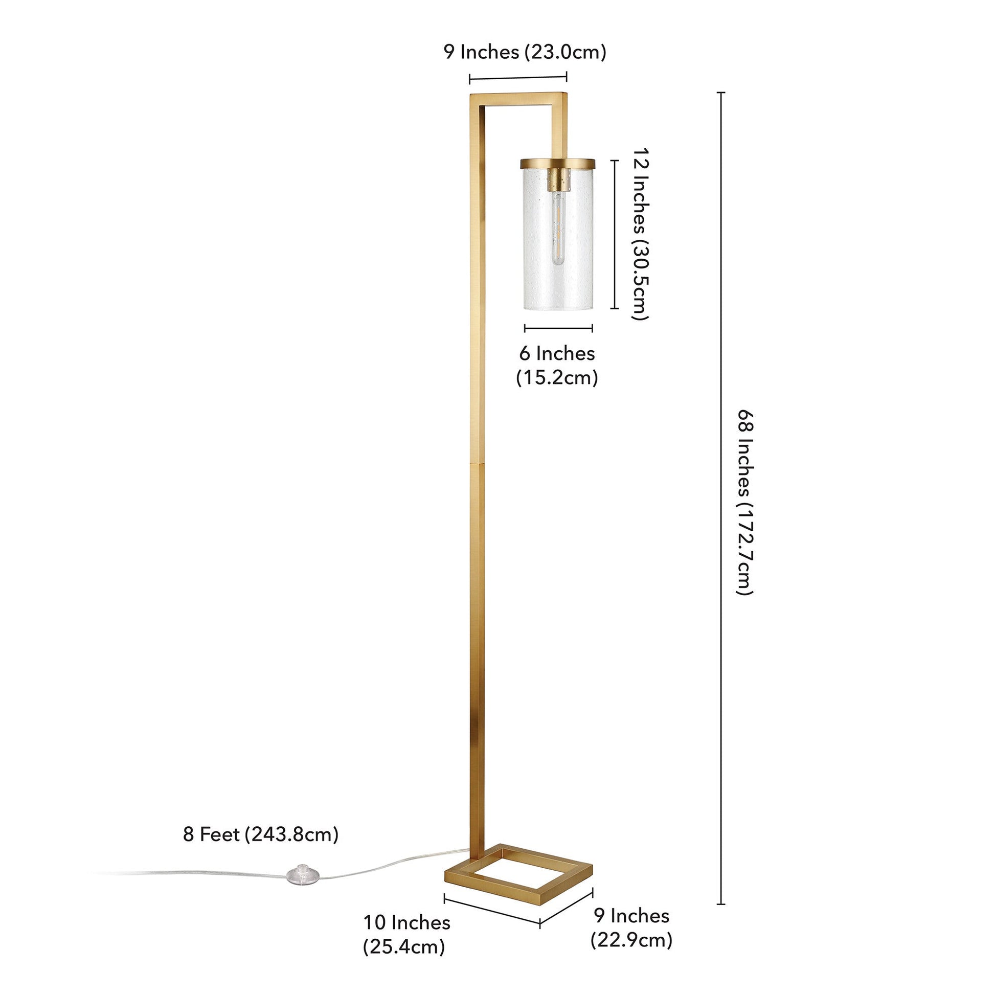 This 67" brass reading floor lamp with clear seeded glass drum shade is the perfect combination of design and function mixed with basic good looks. The base of this lamp is made of brass metal. The brass base coloring infuses a warm and rich tone to your space. The coloration of the brass lamp base creates a fashionable marriage with the the clear glass drum shaped shade. Next to your desk or favorite chair this single base task/reading lamp is designed to make your work or activities easier with concentrated light in just the space you need it. The light that this lamp throws is soft and warm to elevate the look of most any space in your home. Bring some lite and good vibes into your space with this updated and stylishly designed lamp. 67" H x 11" W x 9" D