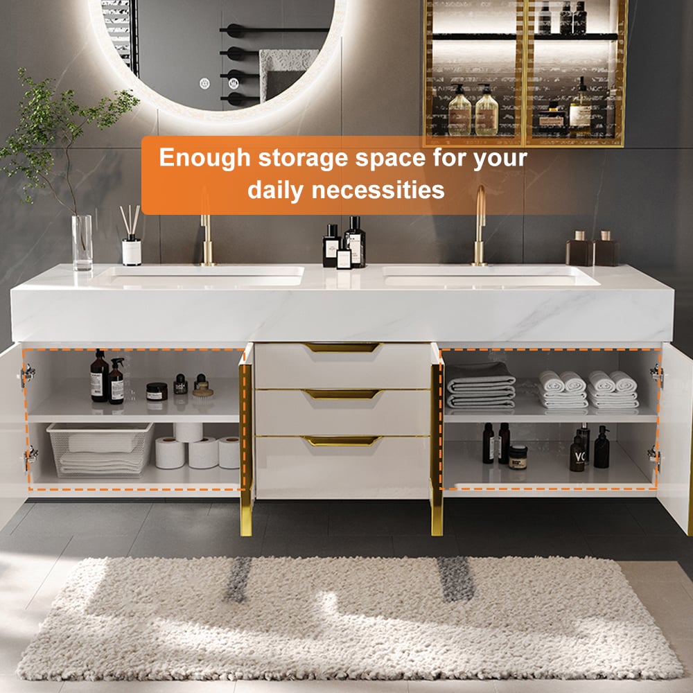 Give your bathrooms a dash of style with this 59" floating bathroom vanity. Sleek wall-mount design keeps floors clear, while the faux marble top adds elegance and durability. The dual ceramic vessel sinks are perfect for everyday use and sharing, while the three-drawer layout keeps all your essentials neatly stored. Its moisture-resistant surface is a breeze to clean, and gold-finish hardware completes the luxurious design. Add some much-desired style and function to your contemporary bathrooms with this vanity.