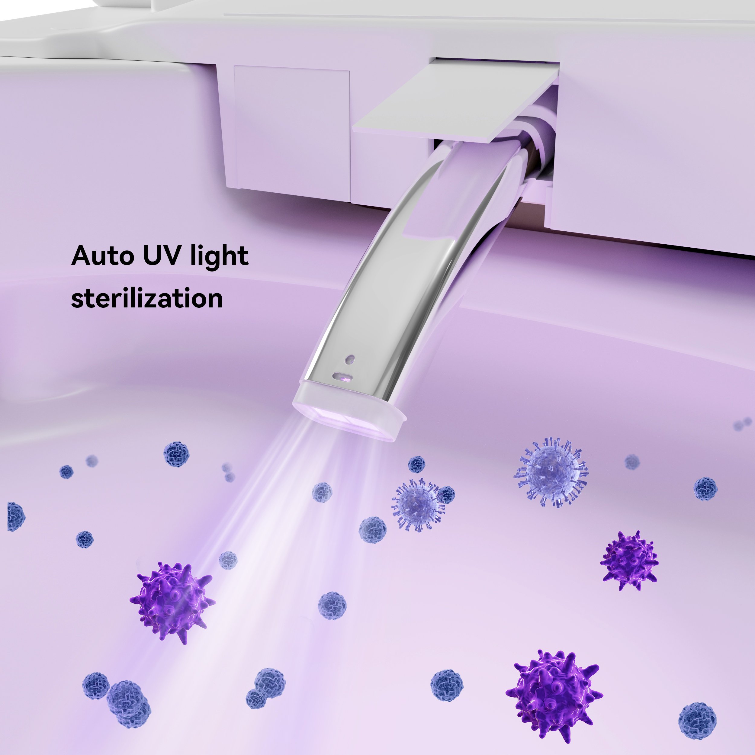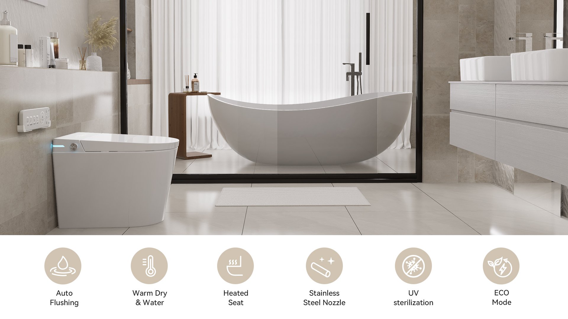 This sleek smart toilet blends modern design with state-of-the-art comfort, such as auto flush, warm water and air dry, heated seat, and hygienic stainless steel nozzle. It also features UV sterilization for added cleanliness and an ECO mode for energy efficiency—bringing a spa-like experience right into your bathroom.