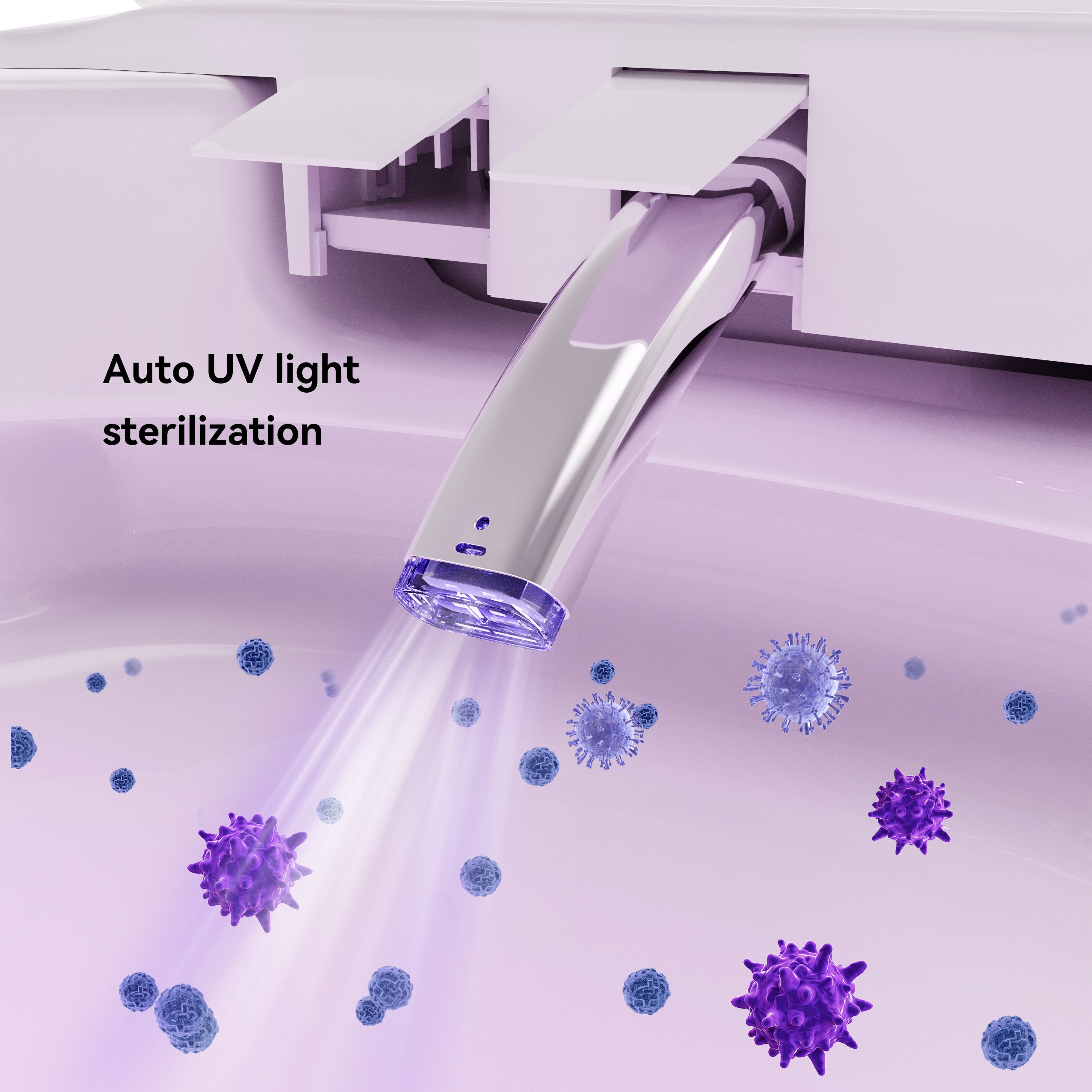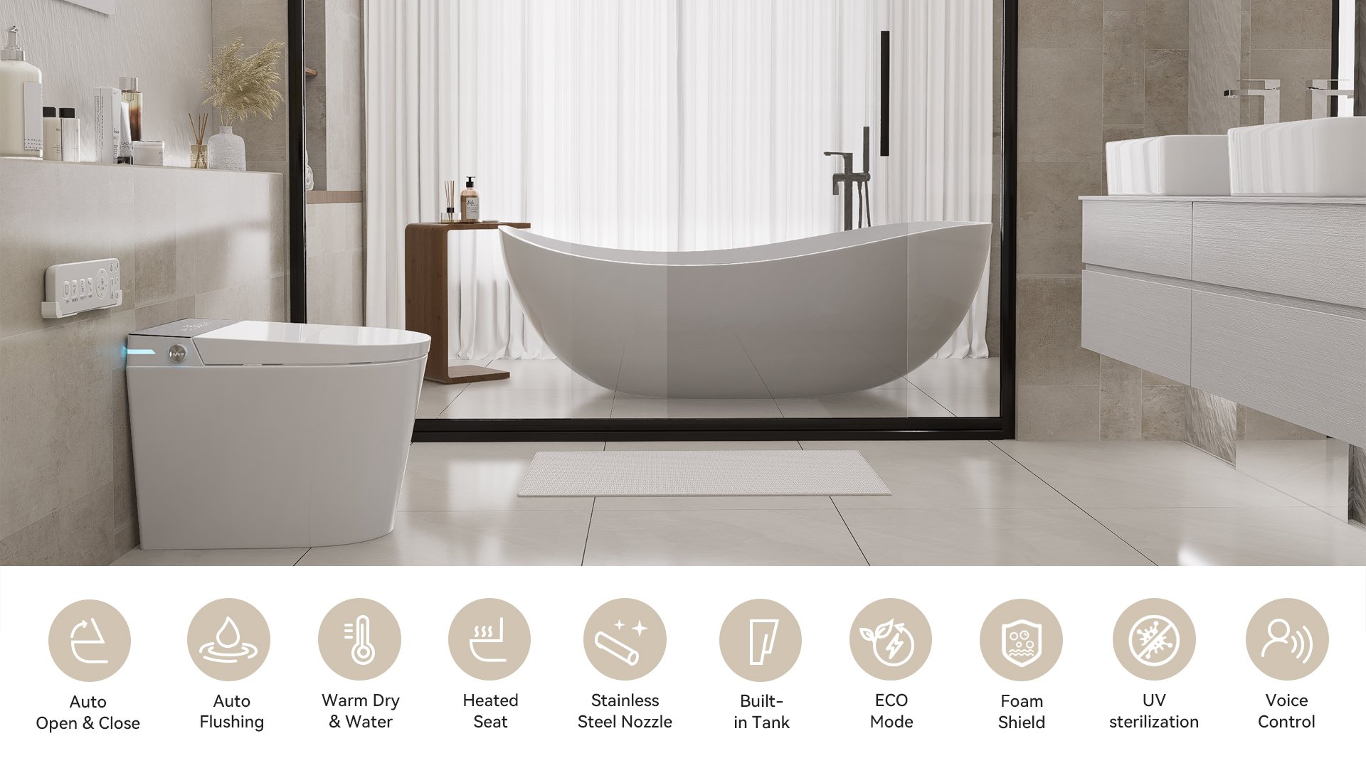 • Toilet Feature: Heated Seat ;Soft Close Seat ;LED Digital Display ;Antimicrobial ;UV Sterilization ;Adjustable Nozzle ;Adjustable Water Presure ;Adjustable Water Temperature ;Nozzle Self-Cleaning ;Warm Dryer ;Atmosphere Light ;Compact Toilet ;Remote Control ;Auto Open Lid