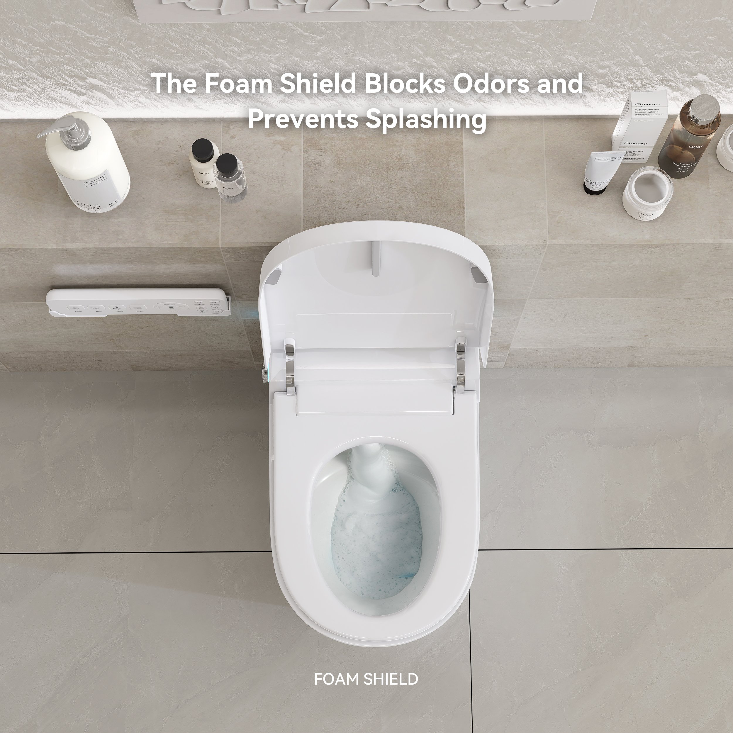 The Foam Shield feature in the smart toilet prevents splashing, enhances cleaning efficiency, saves water, and maintains long-lasting hygiene with eco-friendly materials.