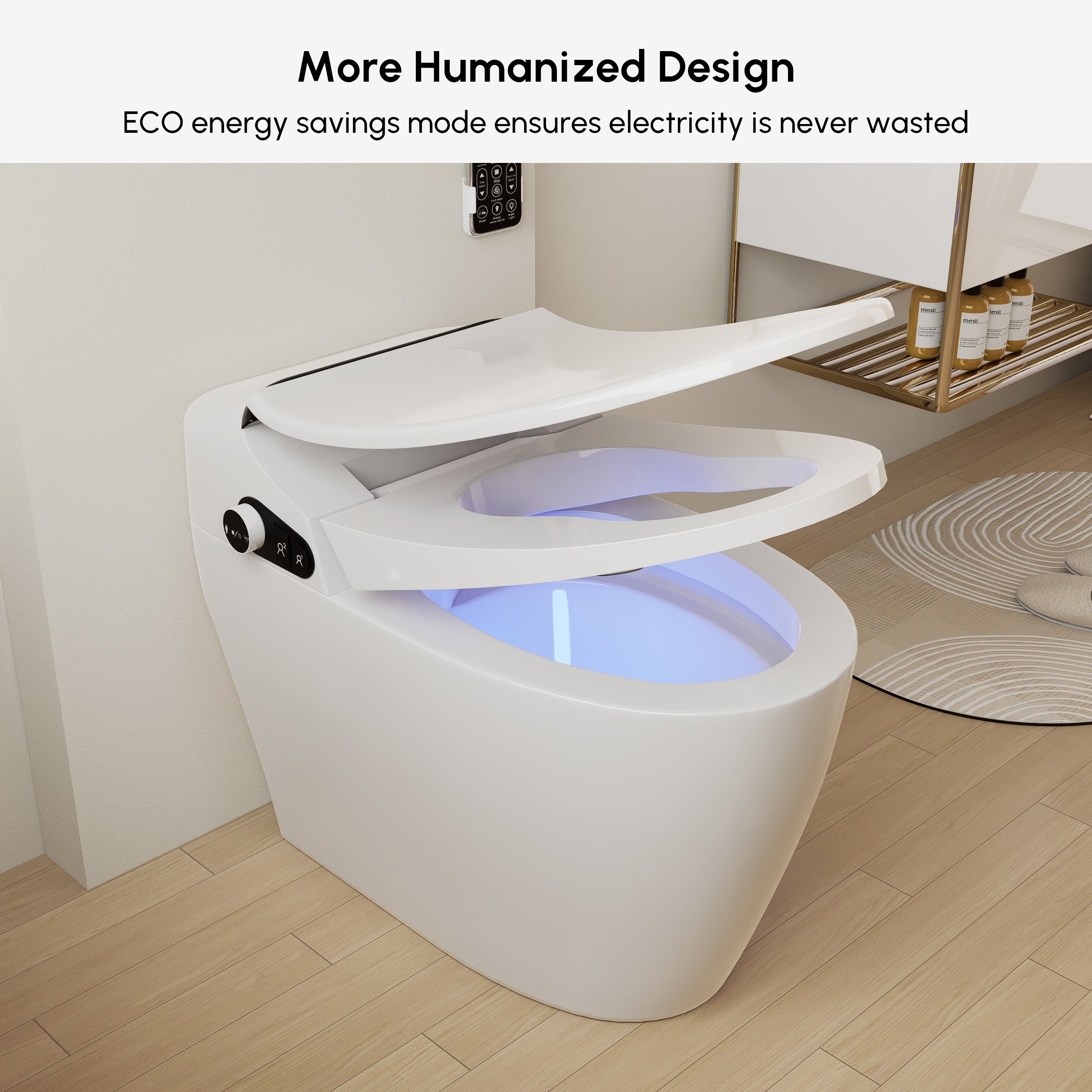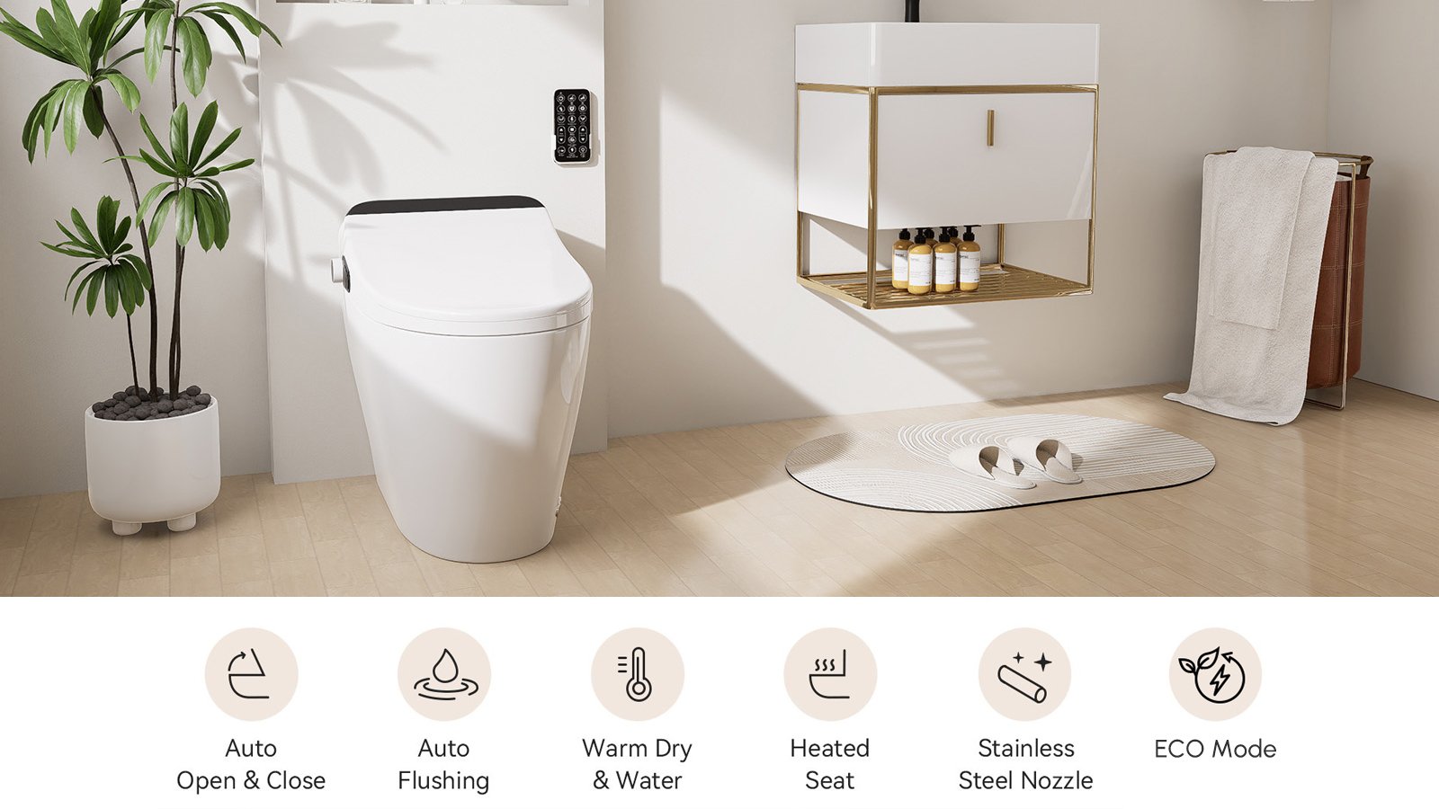 Add a touch of modern style to your bathroom with this elongated one-piece smart toilet, featuring luxury with eco-friendliness. Its Dual User Preferences allow multiple users to save their customized settings, ensuring a personalized experience every time. The Heated Seat provides adjustable warmth for year-round comfort, while the Self-Cleaning Bidet offers customizable position, pressure, and temperature for enhanced hygiene. Enjoy hands-free operation with the Automatic Flush & Lid, complete with a built-in night light for nighttime ease. Designed with sustainability in mind, its Eco-Friendly 1.28 GPF siphon jet minimizes water consumption without compromising performance. Elevate your bathroom experience with this thoughtfully engineered solution!