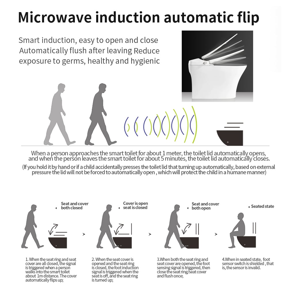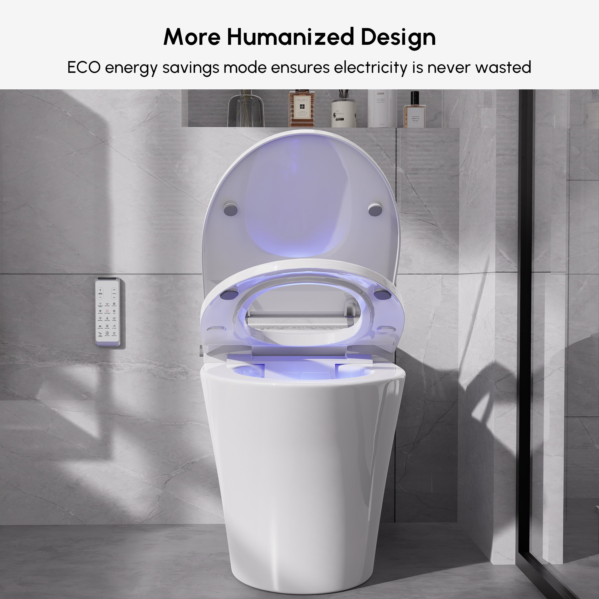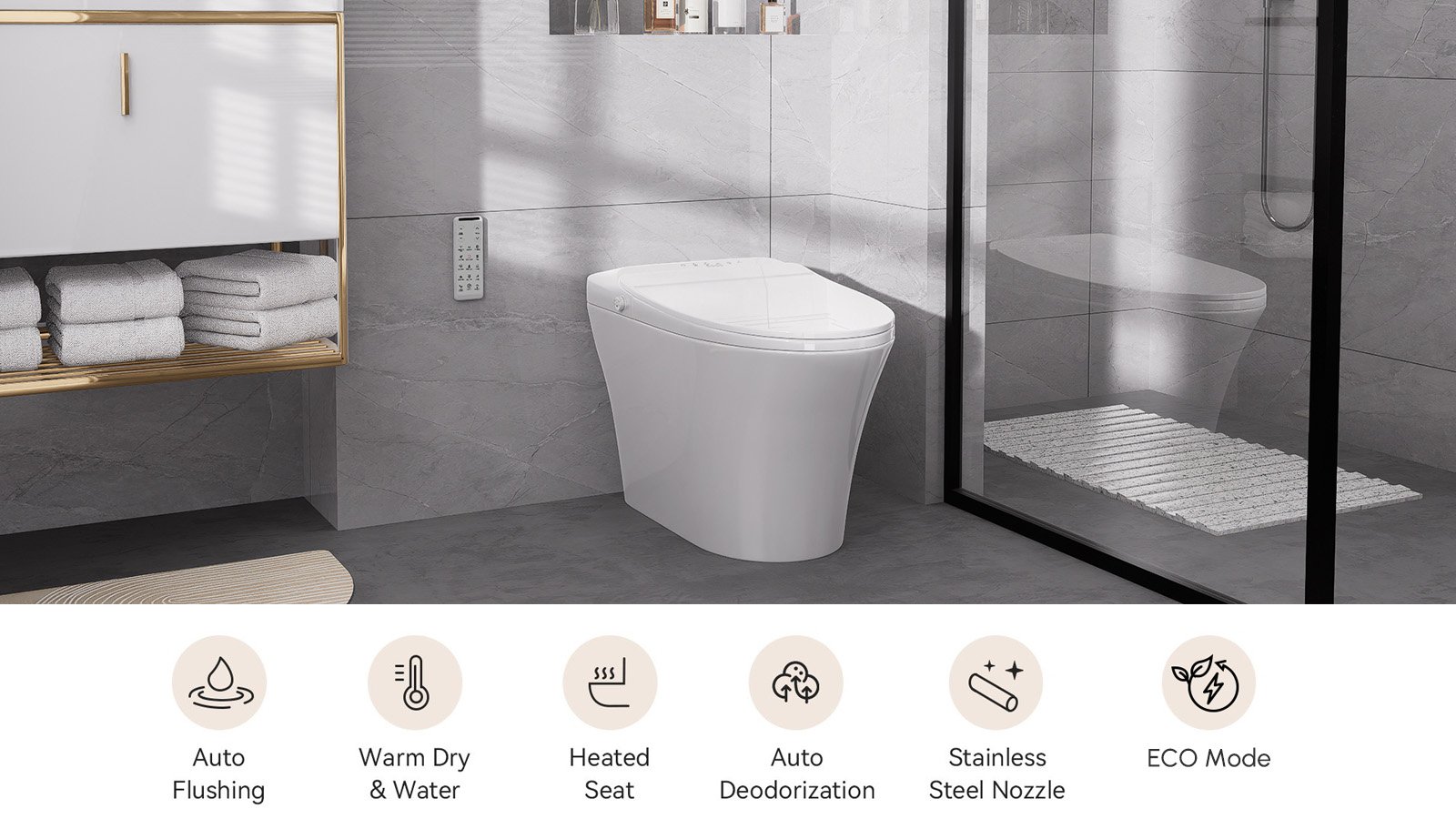 This is the wave of bathroom transformation: a tankless smart toilet with a self-cleaning nozzle, an adjustably heated seat, and adjustable water pressure to ensure a hygienically comfortable situation. The hands-free flushing system is automated, and the eco-friendly 1.32 GPF saves water. This sleek white designed toilet with soft-close features provides a modern functional unit in any bathroom, complete with remote control for easy operation.