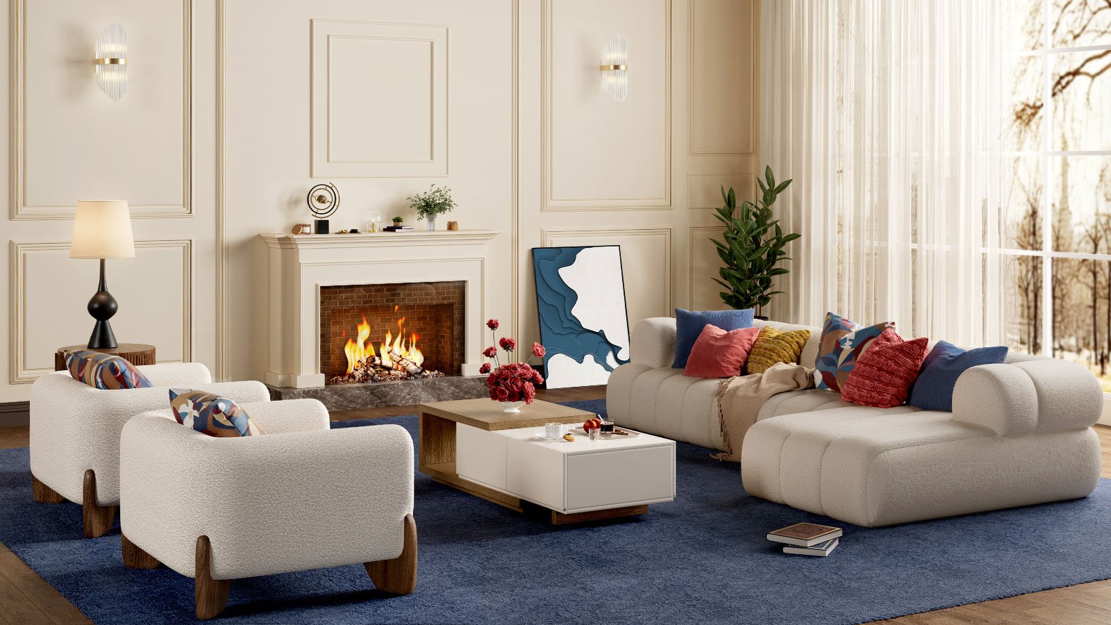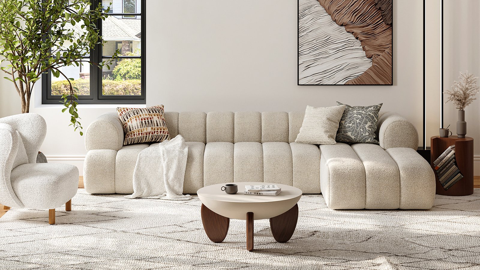Create a cozy, inviting living space with white boucle sofas and walnut-toned furniture. The warm textures and earthy tones exude modern elegance.
